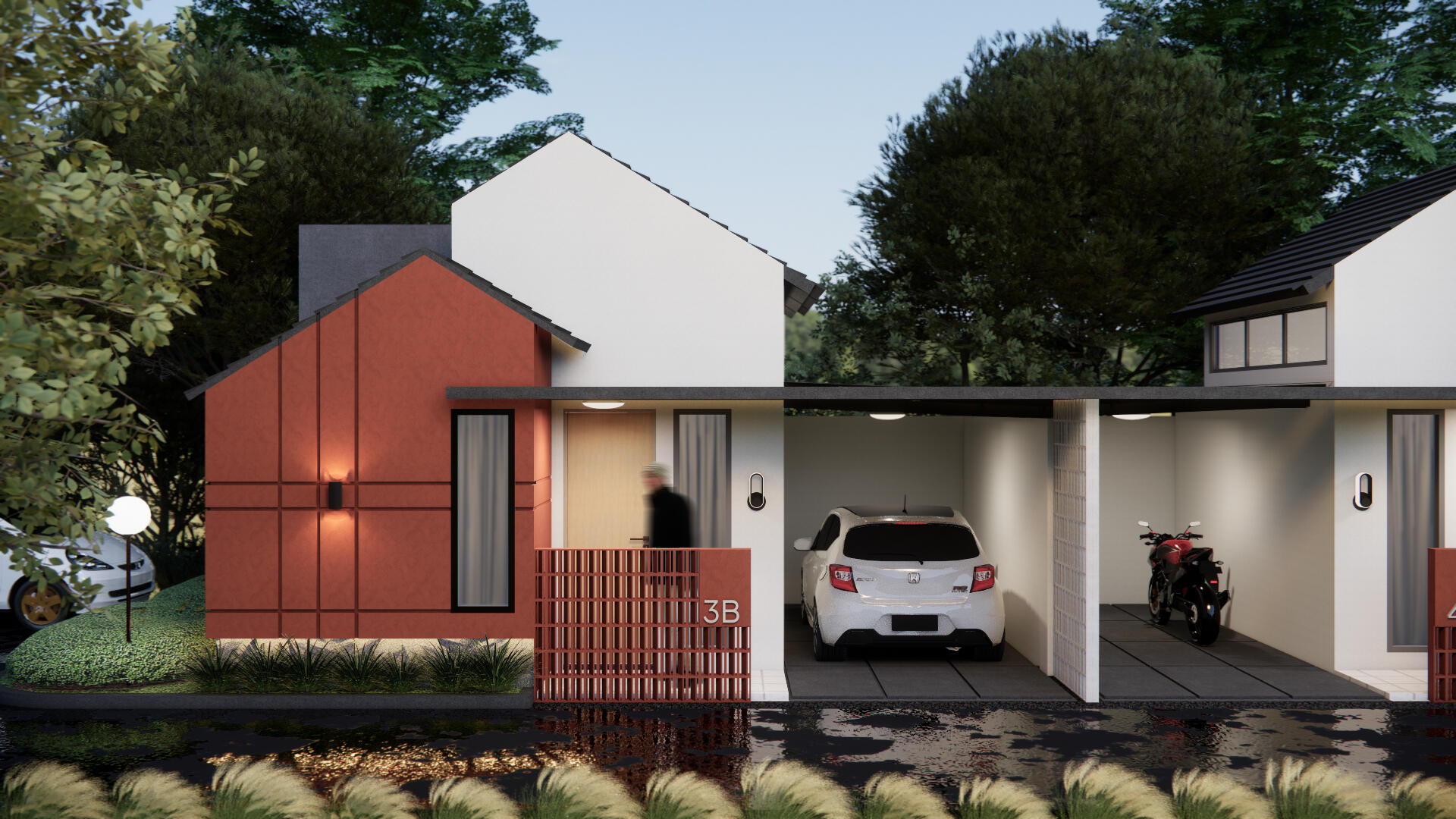 Strategi yang dipilih adalah memecah massa bangunan menjadi dua unit yang berdiri berdampingan dengan halaman bersama sebagai penghubung. Ruang tengah ini berfungsi sebagai titik temu, sementara setiap unit tetap memiliki area sendiri yang jelas batasnya.