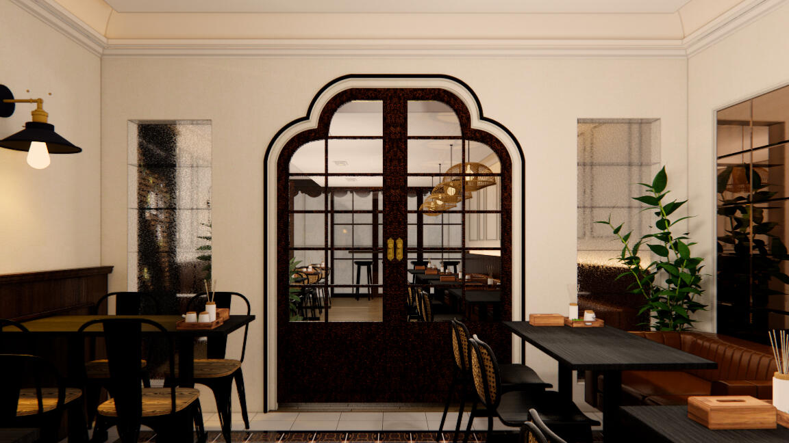 Ruang kafe ini dirancang ulang untuk menonjolkan identitas Aceh melalui perpaduan tema vintage dengan sentuhan Indochine. Elemen pintu Aceh dipilih sebagai aksen khas, sekaligus membedakan wajah bangunan yang berada di antara deretan ruko.