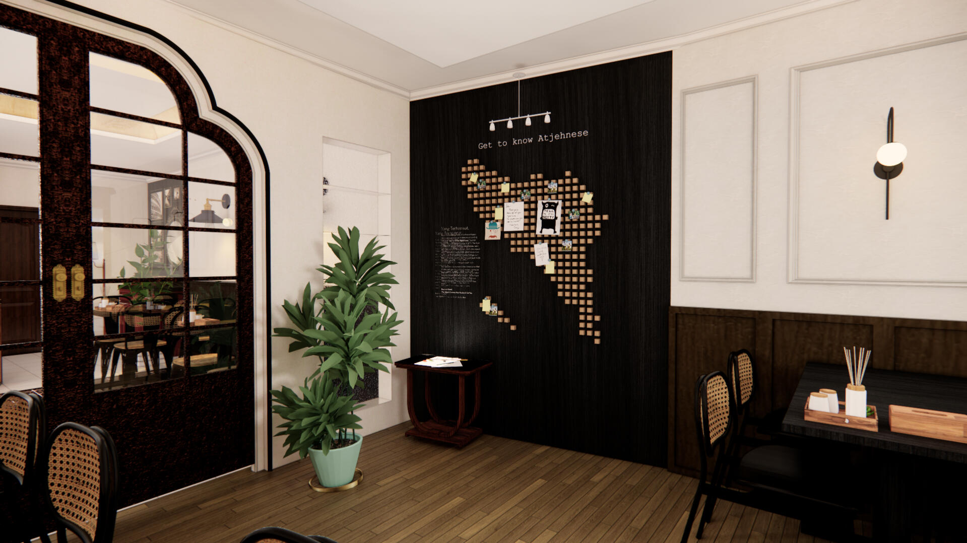 Strategi perancangan diarahkan pada pengalaman visual yang interaktif. Board peta Aceh yang menandai titik persebaran kopi Indonesia dipadukan dengan foto tokoh Aceh, sementara pilihan material kayu gelap, detail moulding, dan furnitur rotan memperkuat nuansa vintage yang hangat.