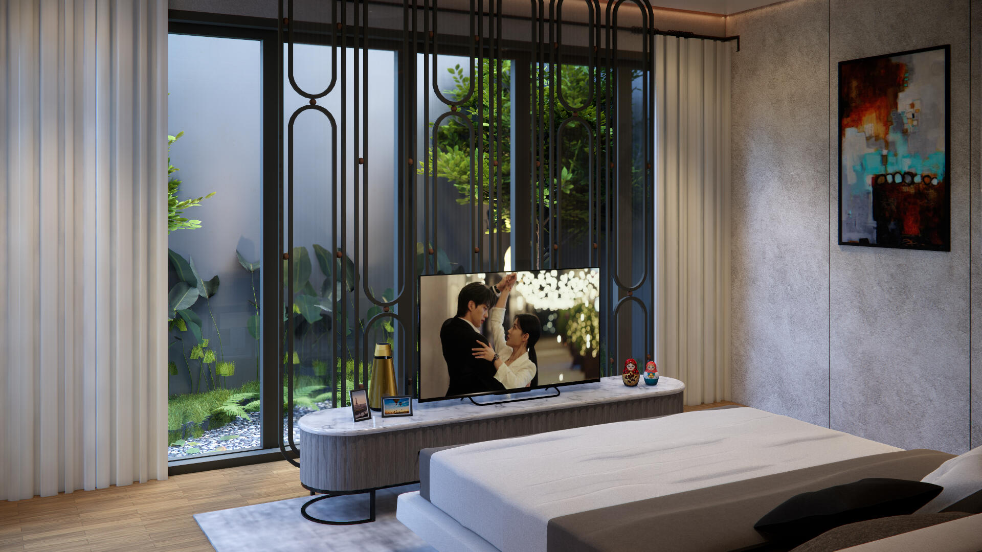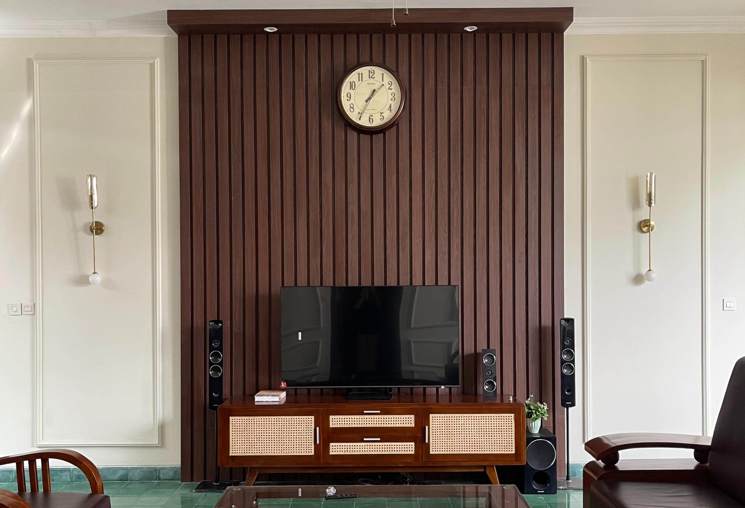 Ruang tamu dan living room ditata dengan sekat partisi fleksibel yang dapat dibuka dan ditutup sesuai kebutuhan. Hal ini memungkinkan rumah beradaptasi saat digunakan untuk acara keluarga besar, sekaligus tetap nyaman untuk aktivitas sehari-hari.