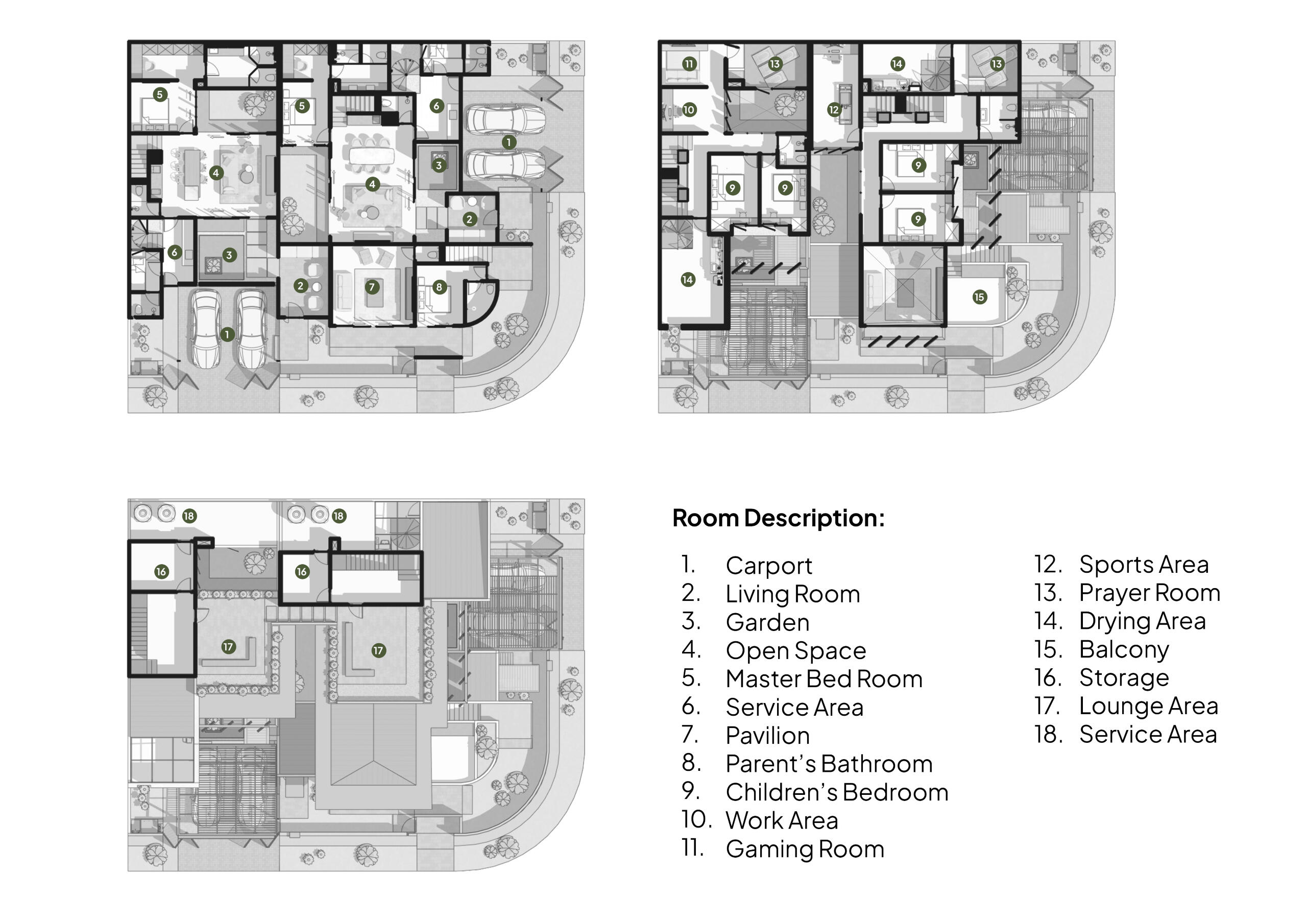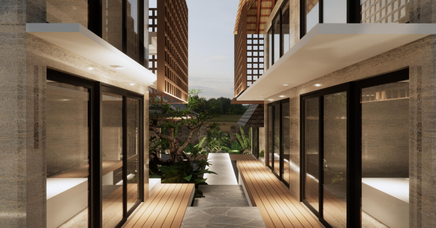 Fasilitas-fasilitas yang ditawarkan dalam guesthouse ini mencakup kamar-kamar tidur yang cerdas dirancang, area bersantai, dan ruang komunal yang mengundang interaksi sosial antara tamu, menciptakan kesempatan bagi keluarga untuk berkumpul dan beraktivitas bersama. Konsep "A Bridge to Serenity" diimplementasikan tidak hanya sebagai pemanis visual, melainkan sebagai landasan bagi kepuasan tamu. Harapannya, setiap tamu yang datang akan meninggalkan tempat ini dengan rasa senang dan ketenangan yang menyertai setelah mengalami suasana yang tenang dan ramah.Sejalan dengan konsep "A Bridge to Serenity," setiap elemen arsitektur dipilih dan disusun dengan teliti, membentuk ruang yang bukan hanya memberikan pelayanan penginapan, tetapi juga merangkul tamu dengan suasana yang hangat dan nyaman. Dengan demikian, guesthouse ini menjadi jembatan menuju pengalaman menginap yang berkesan dan membawa kebahagiaan bagi setiap pengunjungnya.