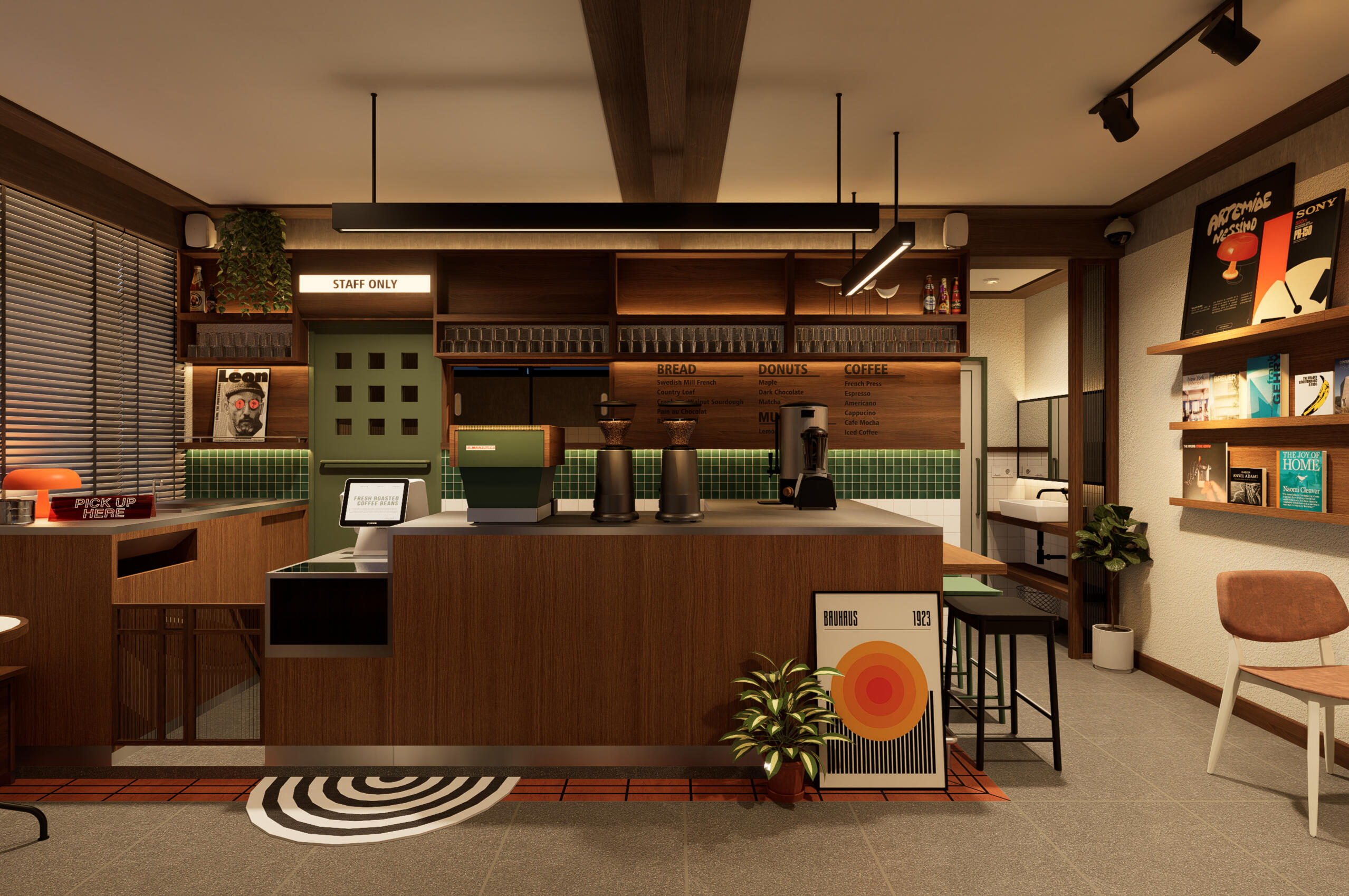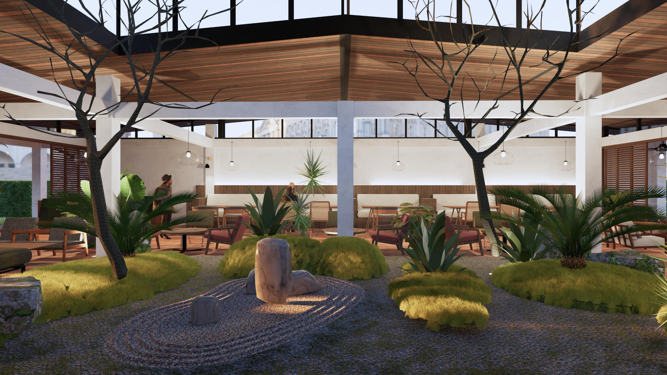 Zonasi ruang disusun berdasarkan alur pergerakan yang cair, pencahayaan alami, serta kemungkinan perubahan fungsi. Area duduk utama ditempatkan di tengah bangunan dan dikelilingi oleh zona transisi yang memungkinkan ruang untuk bernafas, merespons kebutuhan yang terus berkembang. Setiap area memiliki karakter dan atmosfer tersendiri, dari ruang terbuka yang bersinggungan langsung dengan jalan, hingga zona privat yang tenang di bagian dalam.Pengalaman sirkulasi dan pencahayaan menjadi pertimbangan utama dalam membentuk suasana yang hangat dan inklusif. Bukaan eksisting dimaksimalkan untuk memperkuat hubungan visual dengan lingkungan, sementara tambahan ventilasi silang dan pencahayaan lembut ditambahkan untuk menciptakan kenyamanan yang berlangsung sepanjang waktu.Proyek ini menunjukkan bagaimana ruang dapat dirancang bukan hanya sebagai wadah fungsi, melainkan sebagai undangan untuk berhenti sejenak, bertemu, dan terlibat. Ruang yang tumbuh melalui keberadaan manusianya.