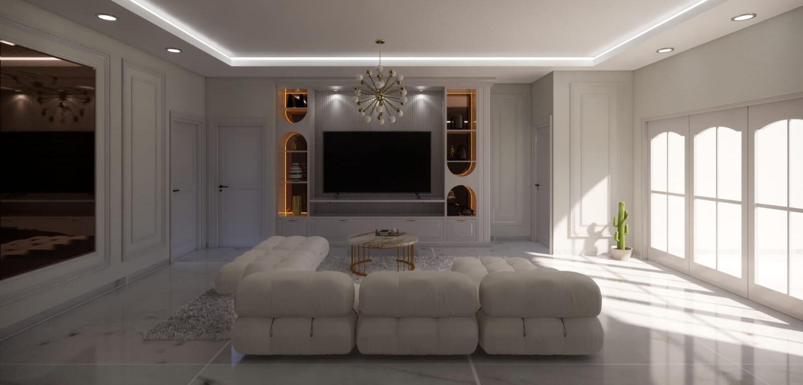 Arah desain untuk area publik dipilih ke gaya clean classic dengan dominasi warna putih dan aksen beige. Hasilnya adalah kombinasi ruang yang hangat, bersih, dan fungsional, mampu menampung dinamika keseharian sekaligus momen kebersamaan dalam skala besar.