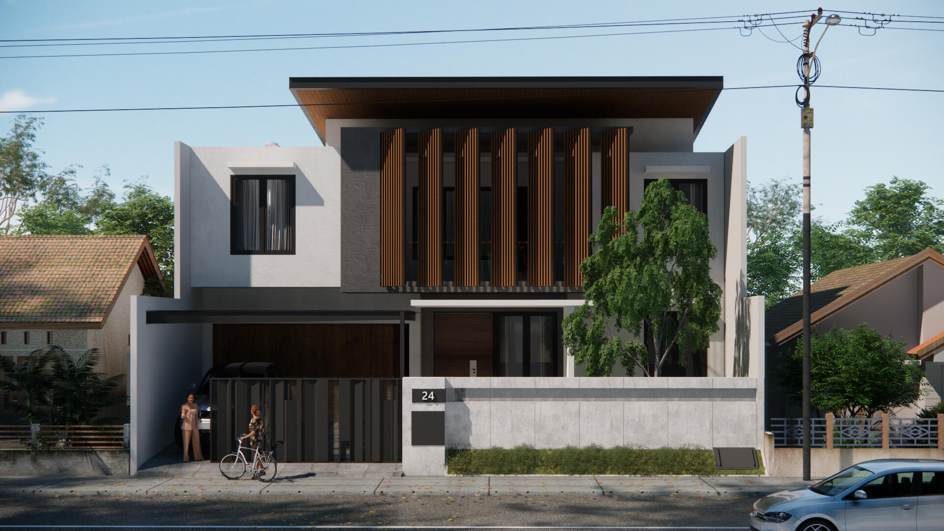 Proyek ini didesain atas perpaduan antara bentuk bangunan minimalis dengan sentuhan Japandi, sebuah kombinasi gaya Jepang dan Scandinavian. Desain menekankan kesederhanaan, fungsionalitas, dan apresiasi terhadap material alami. Sebagai rumah tinggal untuk keluarga, setiap aspek desain disesuaikan dengan kebutuhan dan karakter penggunanya. Keselarasan antara dua gaya yang berbeda melahirkan harmoni yang dibuat sedemikian rupa sehingga tercipta sebuah ruang inspirasi bagi penghuninya.Sebagai muka bangunan yang akan menyambut penghuninya, ditambahkan elemen lis kayu yang diselaraskan dengan corak bangunannya. Desain taman depan terinspirasi oleh gaya taman jepang yang sederhana, dipadukan dengan pemilihan jenis tanaman yang mampu menekankan batas ruang luar dan dalam. Untuk memberi identitas rumah yang lebih eksplisit, nomor rumah dibuat menggunakan corak material alami batu dengan pencahayan ambient lighting.