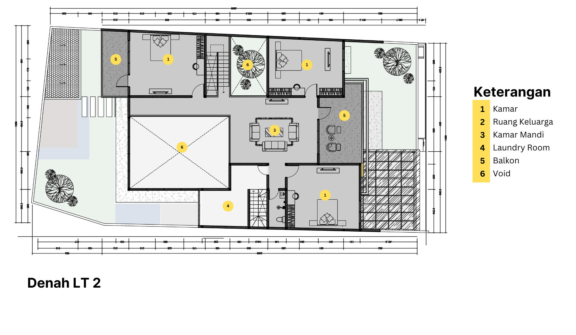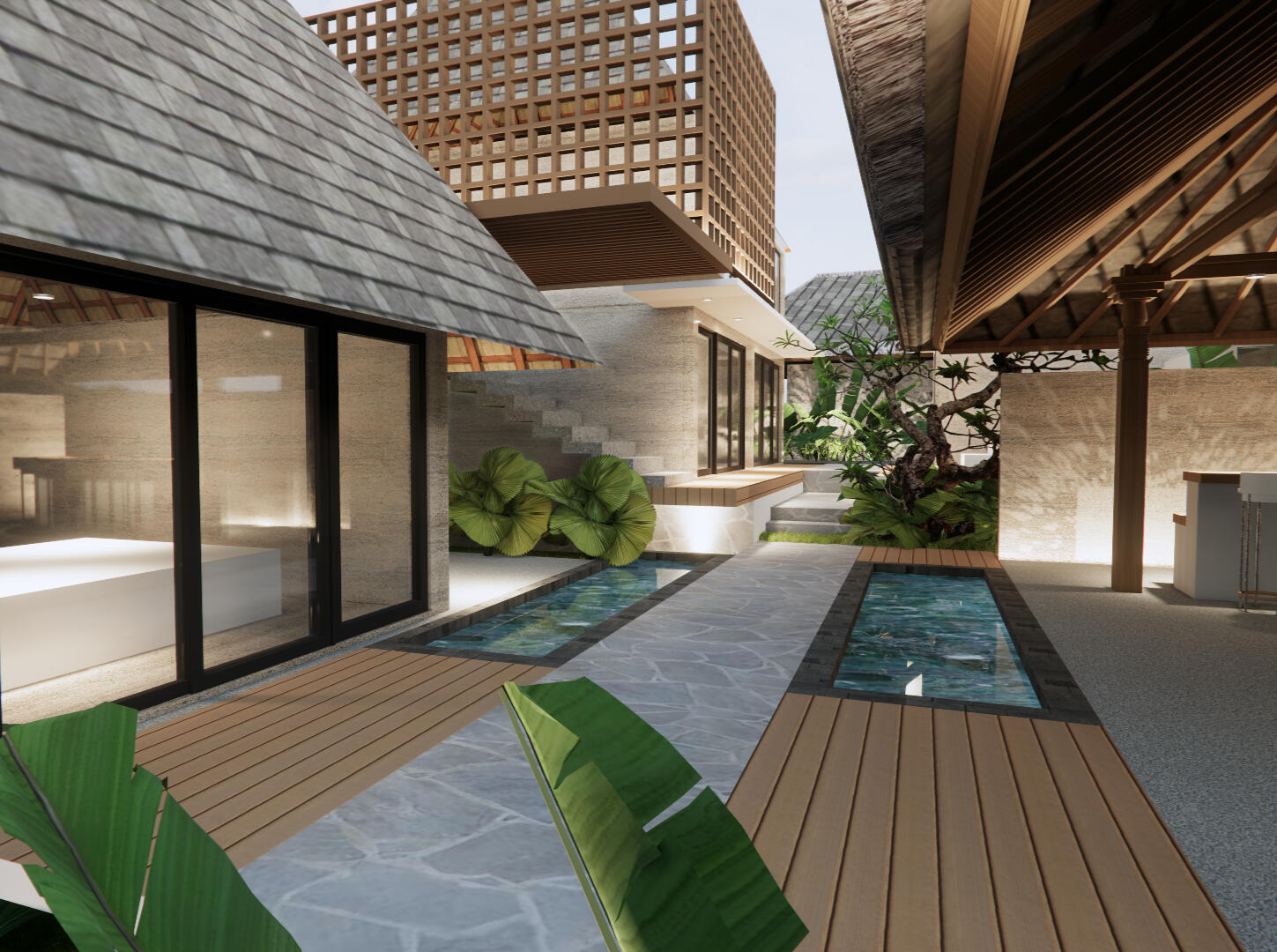 Salah satu elemen bangunan yang kami pertahankan adalah pohon-pohon tinggi yang ada di lahan tersebut, yang kami jadikan sebagai bagian integral dari desain. Pohon-pohon ini tidak hanya dipertahankan, tetapi juga dijadikan sebagai pusat perhatian dengan menjadi bagian dari main entrance hallway, menciptakan daya tarik unik yang memukau. Keunikan desain dari proyek ini terletak pada fungsionalitas bangunan yang beragam, namun tetap berkesinambungan. Dengan memanfaatkan pohon-pohon yang ada, kami berhasil menciptakan bangunan yang memiliki tiga fungsi yang saling terintegrasi: kos kosan, homestay, dan cafe. Ini tidak hanya menciptakan pengalaman yang berbeda bagi setiap penghuninya, tetapi juga meningkatkan nilai estetika dan keasrian lingkungan sekitar.
