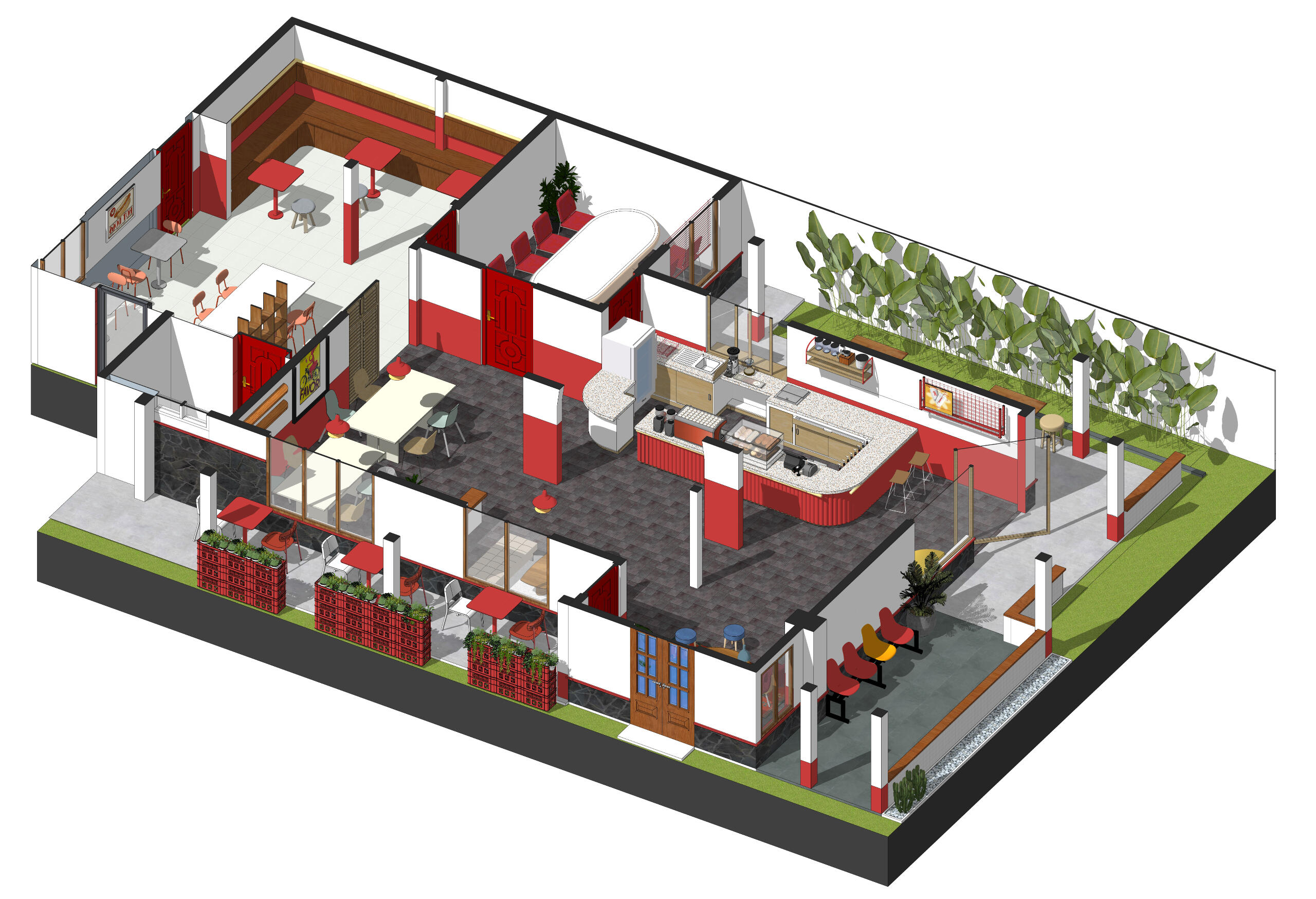 Interior didominasi oleh cat dinding berwarna putih dan merah, menciptakan atmosfer ceria. Aksen kayu dan terasso pada perabotan menambahkan nuansa hangat dan elegan. Area bar di depan dirancang sebagai titik fokus utama, menonjolkan karakteristik unik coffeeshop ini. Sebagai penyedia solusi holistik, selain menangani desain bangunan, kami juga menyediakan desain built-in furniture untuk mempermudah implementasi konsep secara menyeluruh. Dengan demikian, proyek ini tidak hanya mencapai transformasi visual yang mencolok, tetapi juga menciptakan ruang fungsional dan menarik bagi para pengunjung.