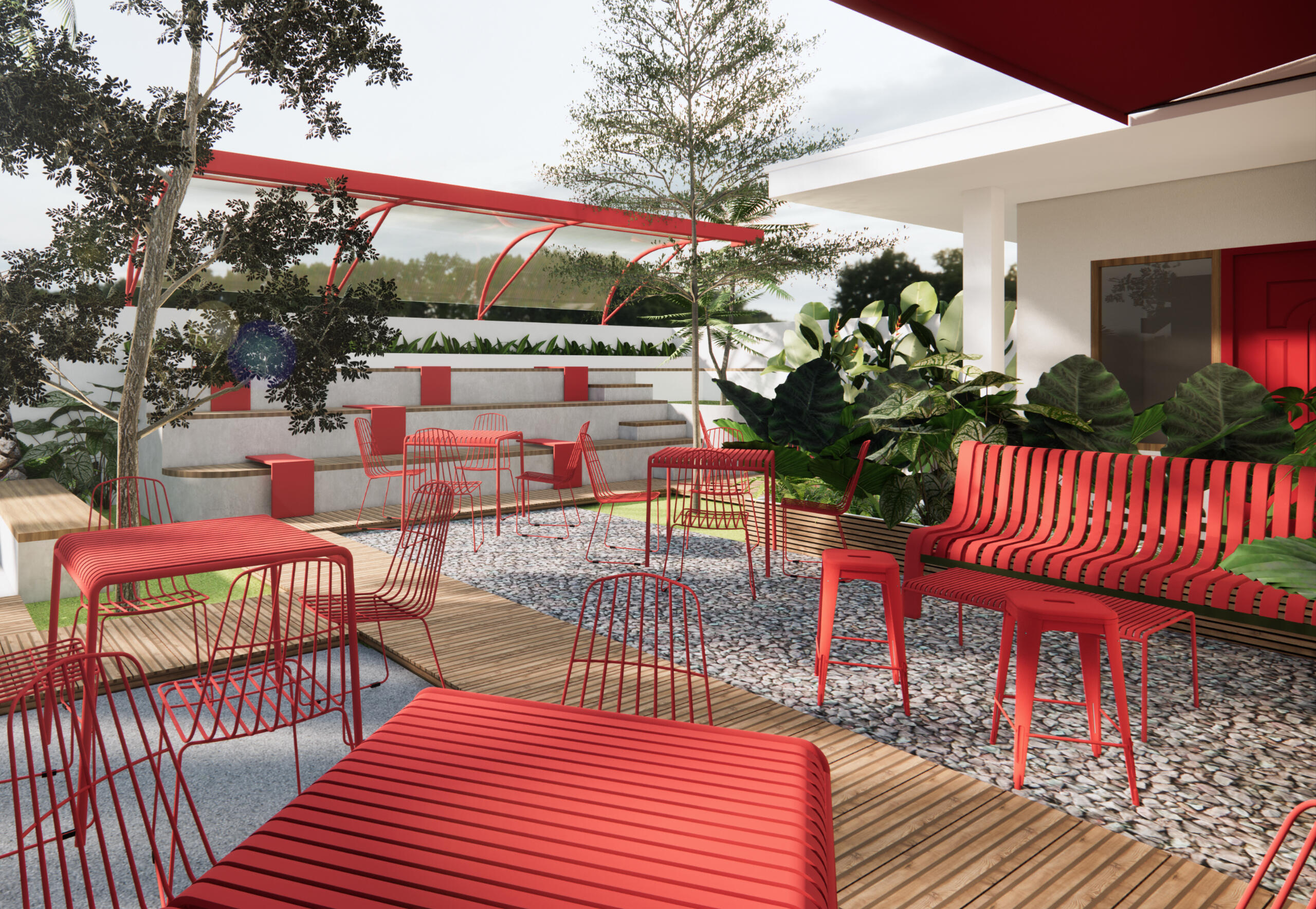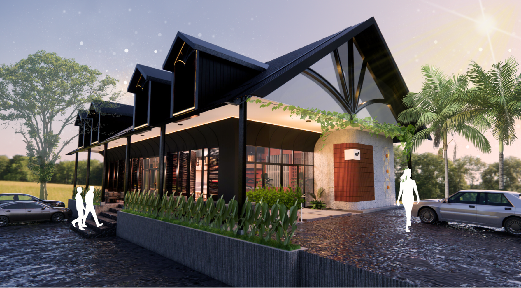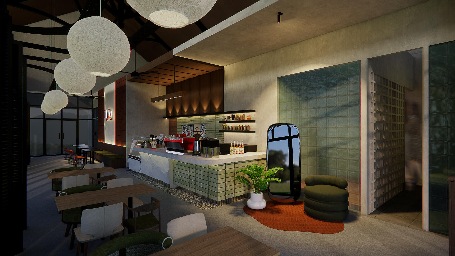 Bertajuk "Ambiance Alami: Desain Unik dengan Sentuhan Mewah dan Fungsional"Kafe ini tidak sekadar tempat bersantap, melainkan sebuah karya arsitektur yang menyajikan pengalaman luar biasa. Dengan fokus pada ambience alami, kafe ini menghadirkan suasana mewah dan kelas tinggi yang dapat dinikmati oleh berbagai kalangan. Desainnya yang serbaguna membuatnya cocok untuk berbagai keperluan, dari pertemuan bisnis hingga pertemuan santai bersama teman. Keunikan desainnya memberikan nilai tambah, menciptakan identitas yang membedakannya dari kafe-kafe lainnya.Khusus bagi para pengunjung, ruang luar yang interaktif dan menarik disajikan sebagai fungsi komunal. Desainnya didukung oleh sentuhan tropis dengan nuansa kontemporer yang modern, menciptakan lingkungan yang memukau dan bersahabat. Setiap sudut kafe dirancang untuk menciptakan pengalaman Instagrammable, mengutamakan desain berorientasi pada pengalaman pengguna. Lebih dari sekadar estetika, desain ini juga merangkul elemen alam, menciptakan hubungan harmonis antara manusia dan lingkungan sekitarnya. Dengan demikian, kafe ini bukan hanya tempat makan dan minum, melainkan destinasi yang memadukan keindahan, keberlanjutan, dan kenyamanan.