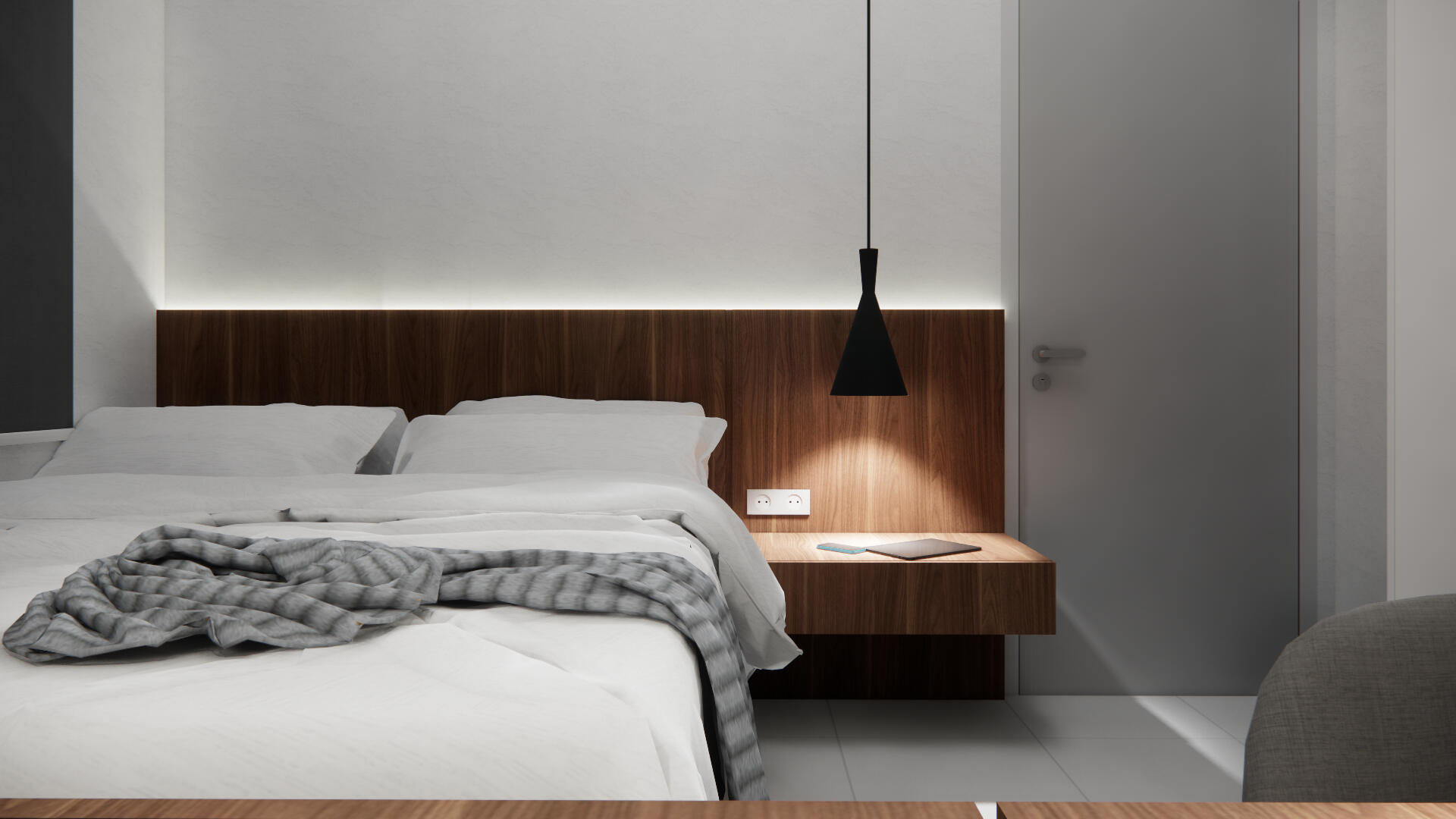 Kamar tidur diarahkan ke nuansa semi mid-century. Untuk mendukung aktivitas penggunanya yang masih kuliah dan gemar membaca, ditambahkan peg board interaktif serta rak buku sebagai showcase kecil. Elemen ini tidak hanya berfungsi praktis, tetapi juga menjadi aksen visual yang personal.